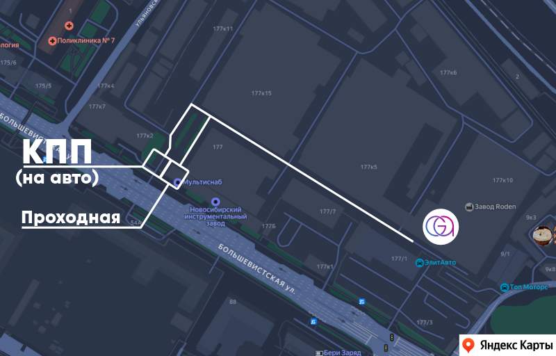 630083, г. Новосибирск, ул. Большевистская, 177, к10 (терратория Инструментального завода). Проезд и проход через проходную и КПП.